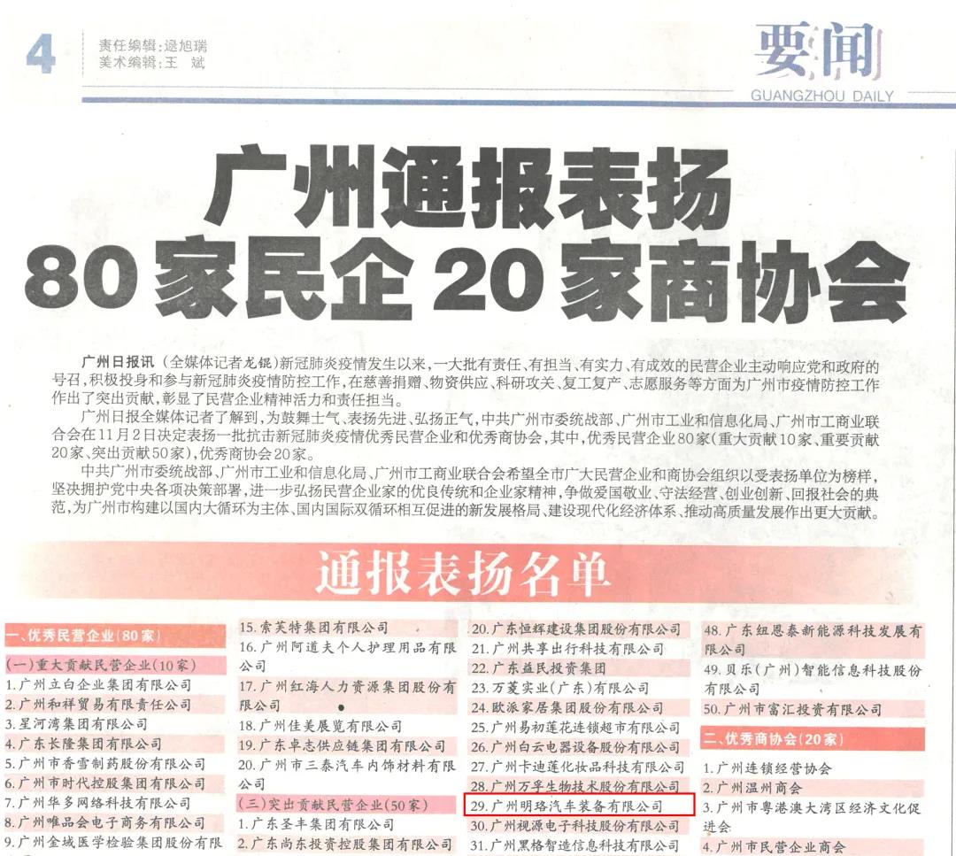11月2日,为鼓舞士气、表扬先进、弘扬正气,中共广州市委统战部、广州市工业和信息化局、广州市工商业联合会决定表扬一批抗击新冠肺炎疫情优秀民营企业和优秀商协会,此次共80家优秀民营企业获通报表扬,广州明珞装备股份有限公司光荣上榜,并以优秀表现荣获“广州市抗击新冠肺炎疫情突出贡献民营企业”称号。