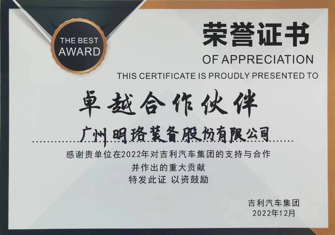7年来,明珞总拼系统高效稳定的交付,获得吉利多个生产基地的认可。先后获得吉利客户颁发的金牌供应商(2018)、产能提升奖(2018)、优秀供应商(2019)、卓越贡献团队(2021、2022)、集团卓越合作伙伴(2022)。